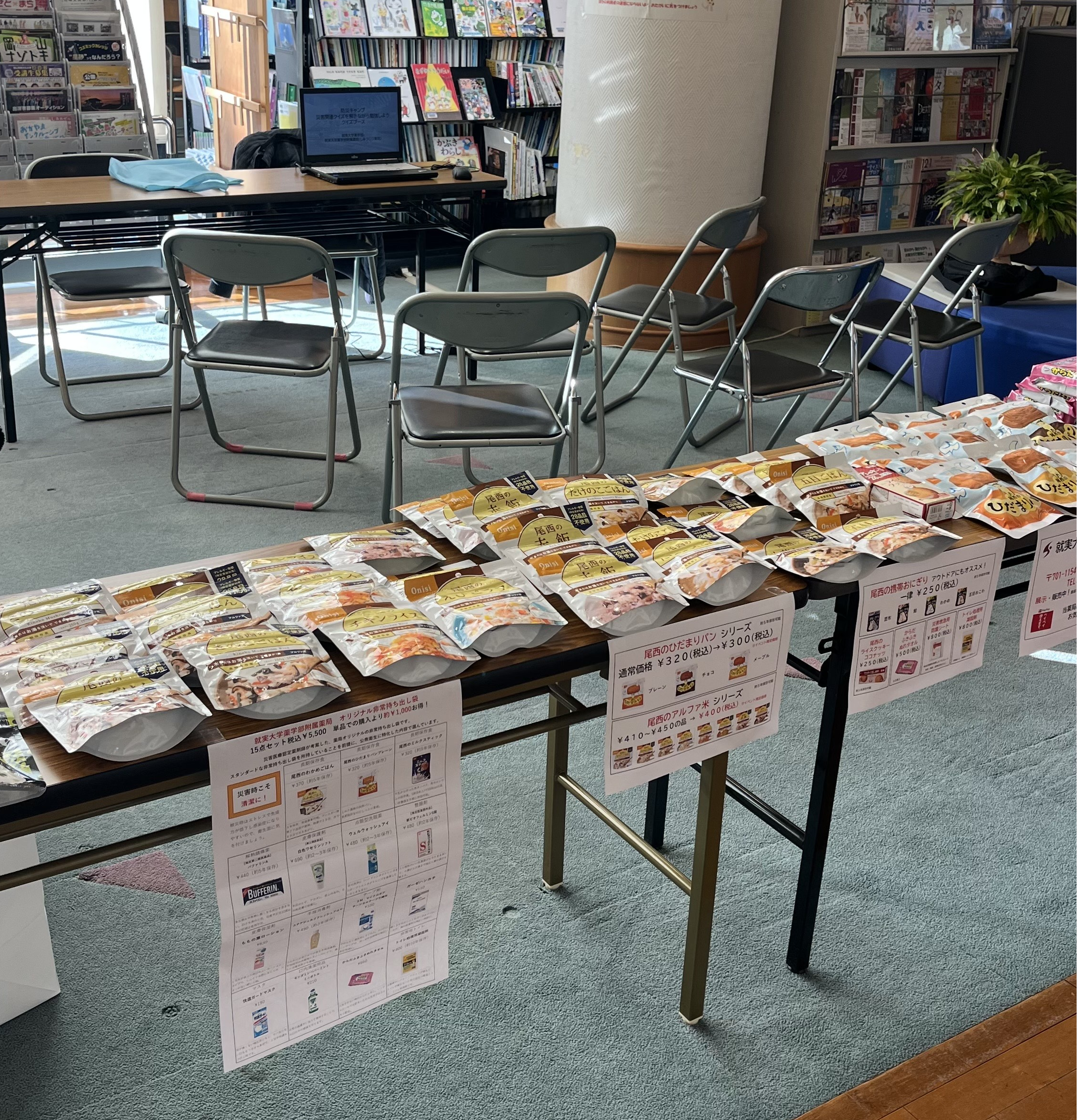 展示・販売コーナーでは、試食でお配りしたひだまりパンが好評でした。尾西食品さんの防災食は長期保存ができ味も本格的で非常に美味しいため、とても人気でした。
