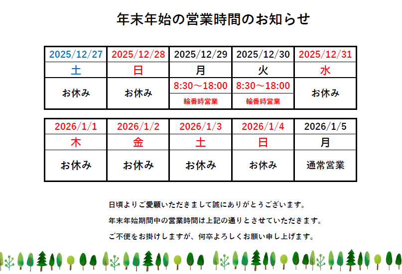 2025/10/27 2025年年末年始営業日のお知らせ